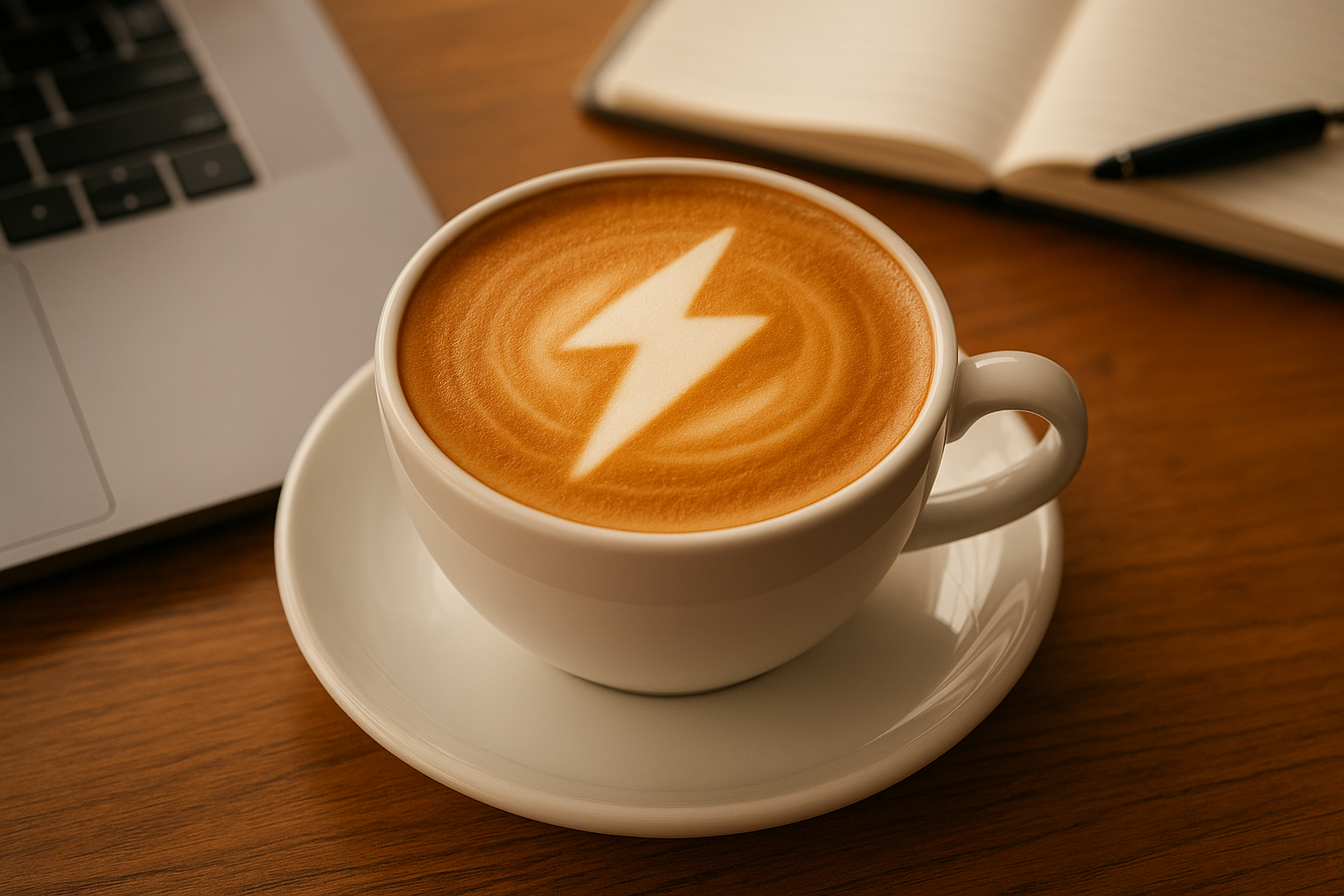 Secangkir latte hangat dengan latte art berbentuk petir, simbol semangat lembut yang membangkitkan energi dan fokus di awal hari.