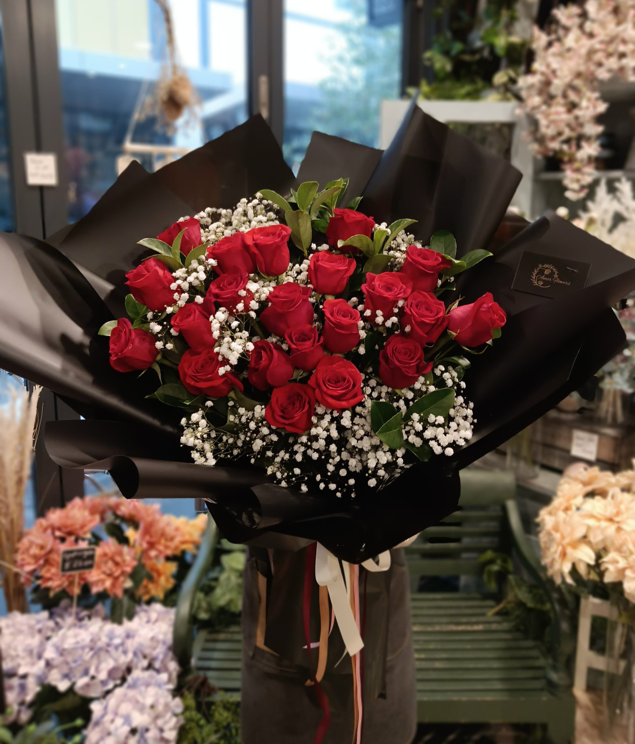 Gunakan dedaunan atau tanaman hijau untuk memberikan kesan alami dan lebih penuh pada buket. Letakkan di sela-sela bunga agar terlihat lebih segar dan elegan.