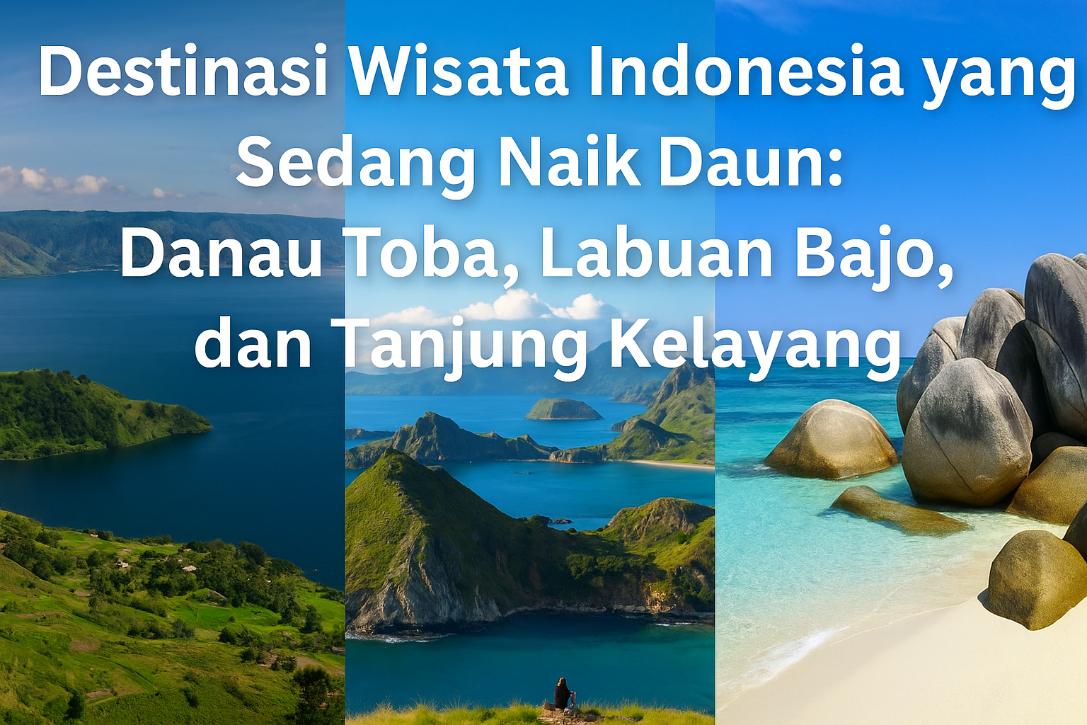 Tiga surga wisata yang tengah populer di Indonesia: Danau Toba dengan danau vulkaniknya yang megah, Labuan Bajo yang eksotis, dan pantai granit unik Tanjung Kelayang.