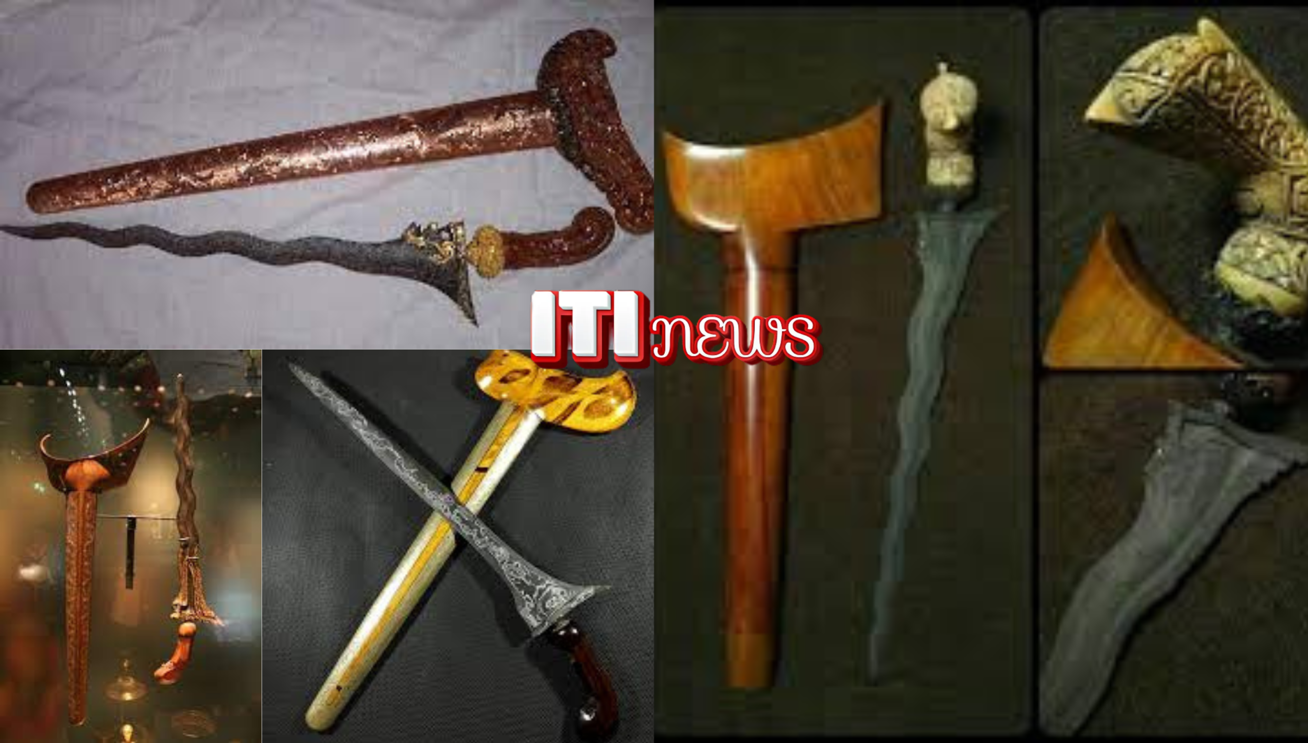 Berbagai jenis keris tradisional Indonesia dengan ukiran khas, digunakan sebagai simbol kehormatan dan status sosial