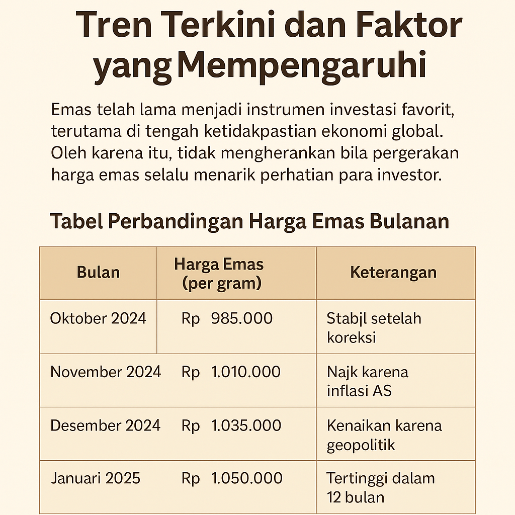 Tabel perbandingan harga emas per gram dari Oktober 2024 hingga Maret 2025, menunjukkan tren kenaikan dan penurunan harga berdasarkan faktor global.