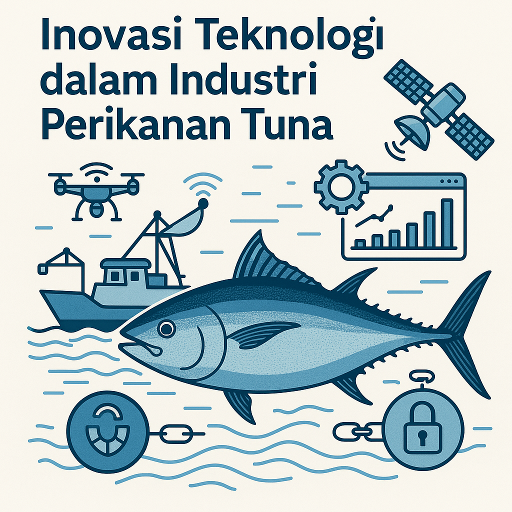 ilustratif yang menunjukkan penerapan teknologi modern seperti satelit, drone, dan sistem digital dalam industri perikanan tuna di Indonesia.