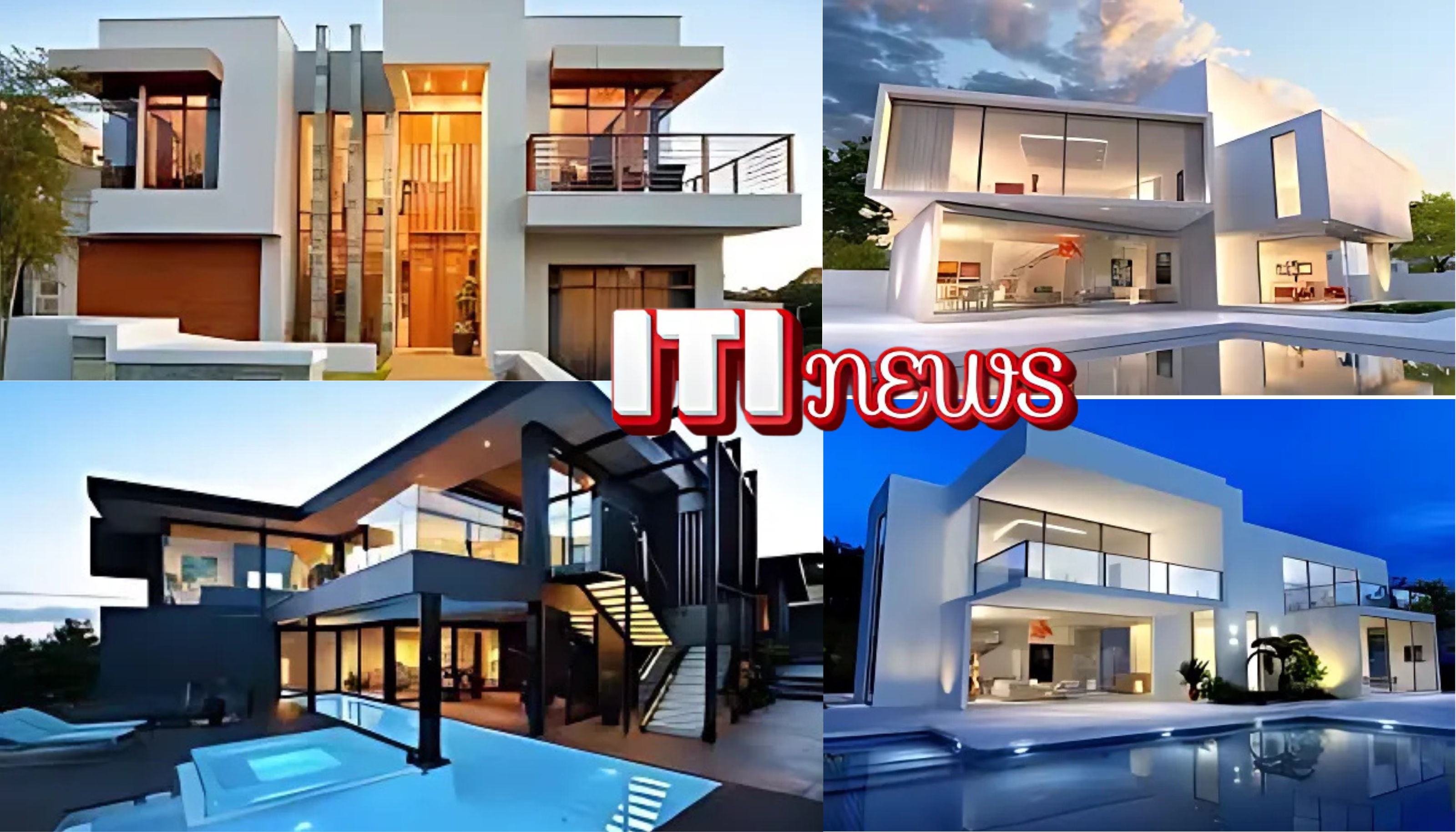Gambar ini menampilkan empat desain rumah mewah dengan gaya modern dan minimalis, dilengkapi dengan pencahayaan artistik dan kolam renang."