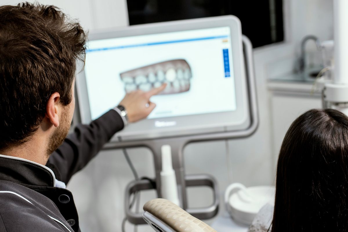 Dokter gigi sedang melakukan pemeriksaan menggunakan alat teknologi canggih untuk mendiagnosis masalah mulut dan gigi pasien.