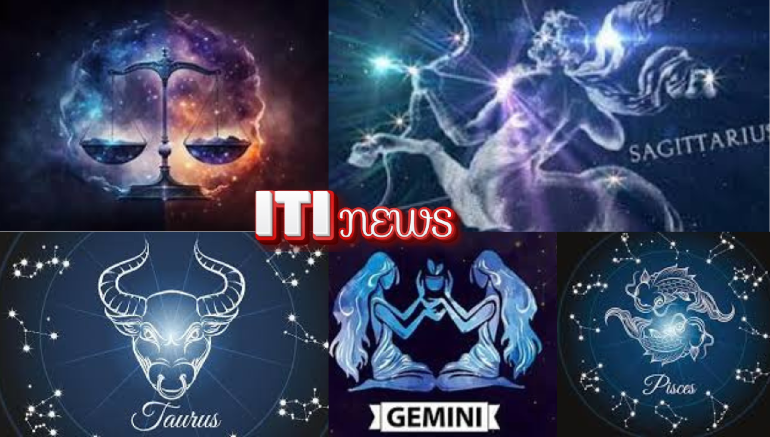 Gambar menampilkan simbol lima zodiak yang diprediksi akan mendapatkan keberuntungan finansial pada 28 Mei 2025, yaitu Libra, Sagittarius, Taurus, Gemini, dan Pisces