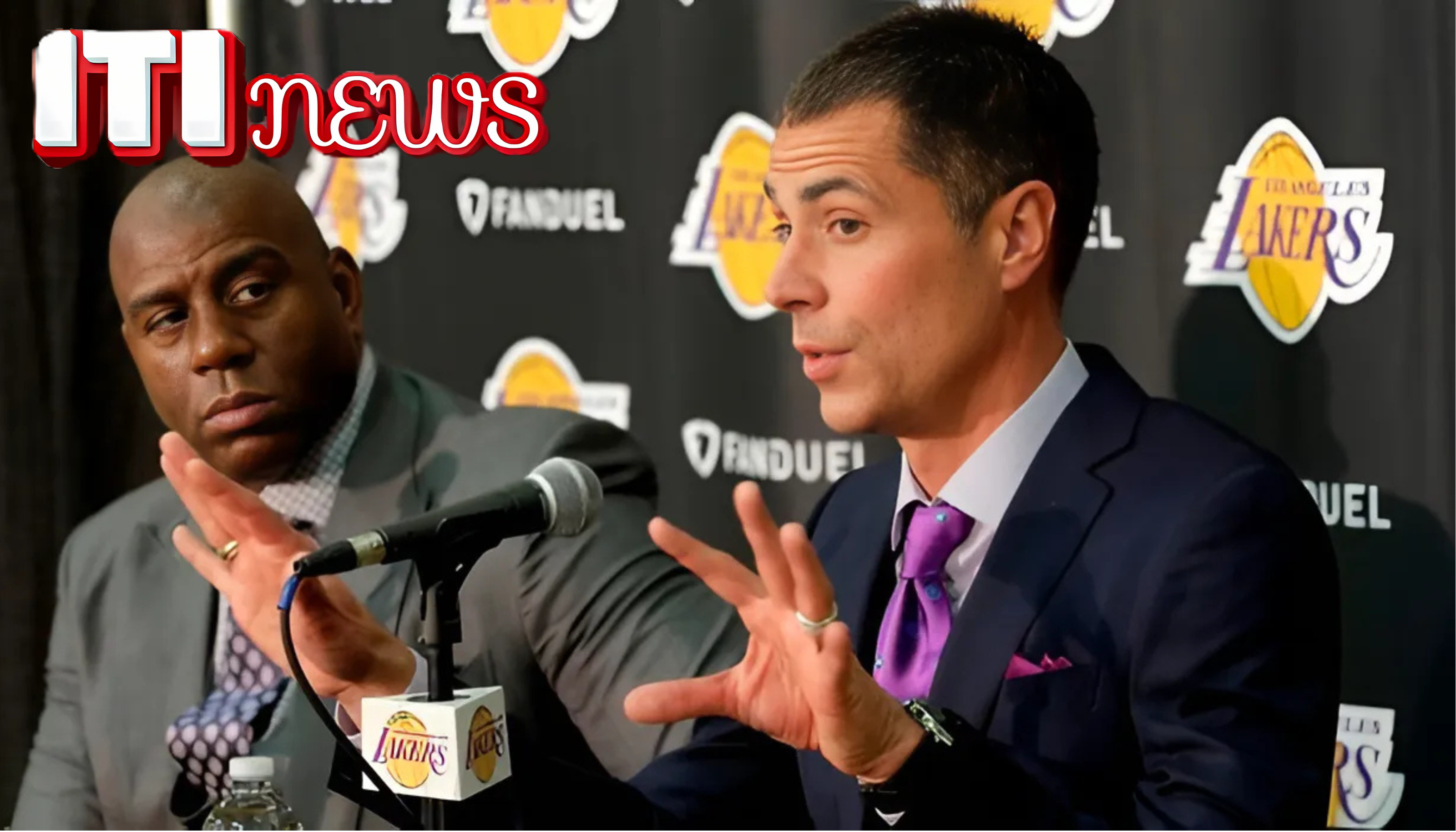 Rob Pelinka, General Manager Los Angeles Lakers, berbicara dalam konferensi pers terkait perpanjangan kontraknya hingga musim 2025-2026, dengan Magic Johnson di sampingnya
