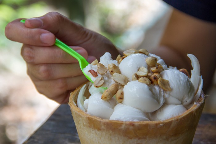 Mirip dengan Indonesia, mudah sekali mendapatkan kelapa di Thailand. Di negara asalnya, es krim kelapa ini menjadi menu yang populer di pasar terapung Thailand.