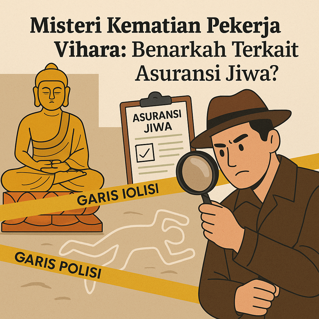 menyelidiki lokasi kematian seorang pekerja vihara, diiringi simbol-simbol keagamaan dan dokumen klaim asuransi jiwa, menggambarkan dugaan motif di balik insiden tragis tersebut