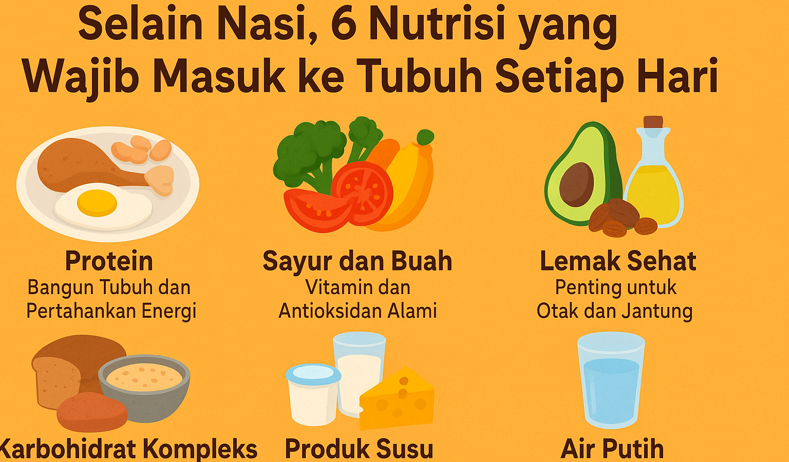Nasi memang menjadi makanan pokok bagi banyak orang, terutama di Asia. Namun, tubuh kita tidak hanya membutuhkan karbohidrat dari nasi. Agar tetap sehat, bugar, dan berenergi, ada beberapa jenis makanan dan nutrisi yang sebaiknya dikonsumsi setiap hari.