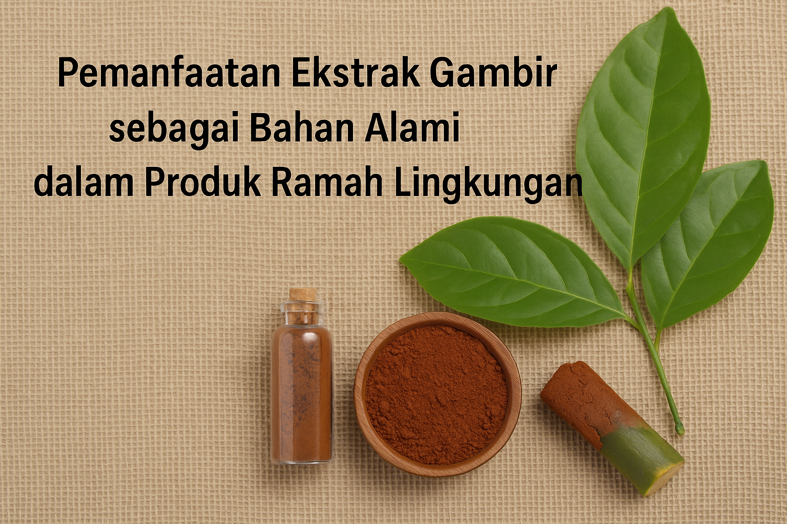 Gambar menampilkan ekstrak gambir alami yang digunakan sebagai bahan utama dalam produk ramah lingkungan, seperti kosmetik, makanan, dan pengolahan limbah.