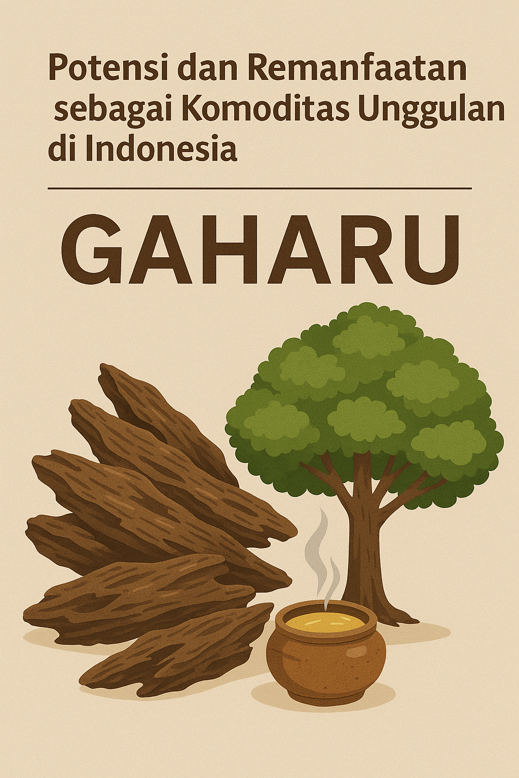 Gambar ilustrasi yang menjelaskan gaharu sebagai sumber daya alam bernilai tinggi, digunakan untuk parfum, obat, dan produk budaya
