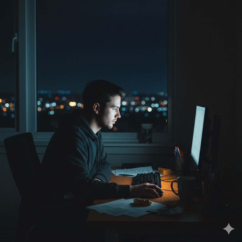 Dedikasi tanpa batas: Suasana hening saat pekerja malam menyelesaikan tugas di depan layar yang menyala lembut.