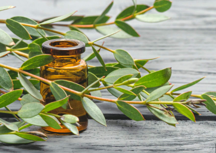 Foto botol minyak eukaliptus murni dengan daun hijau segar, mencerminkan kesegaran dan manfaat alami dari tanaman eukaliptus.