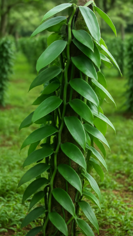 Foto realistis yang menampilkan tanaman vanila tumbuh di lahan tropis dengan sistem penopang alami. Daunnya tampak hijau segar dan tersusun rapi di sepanjang batang.