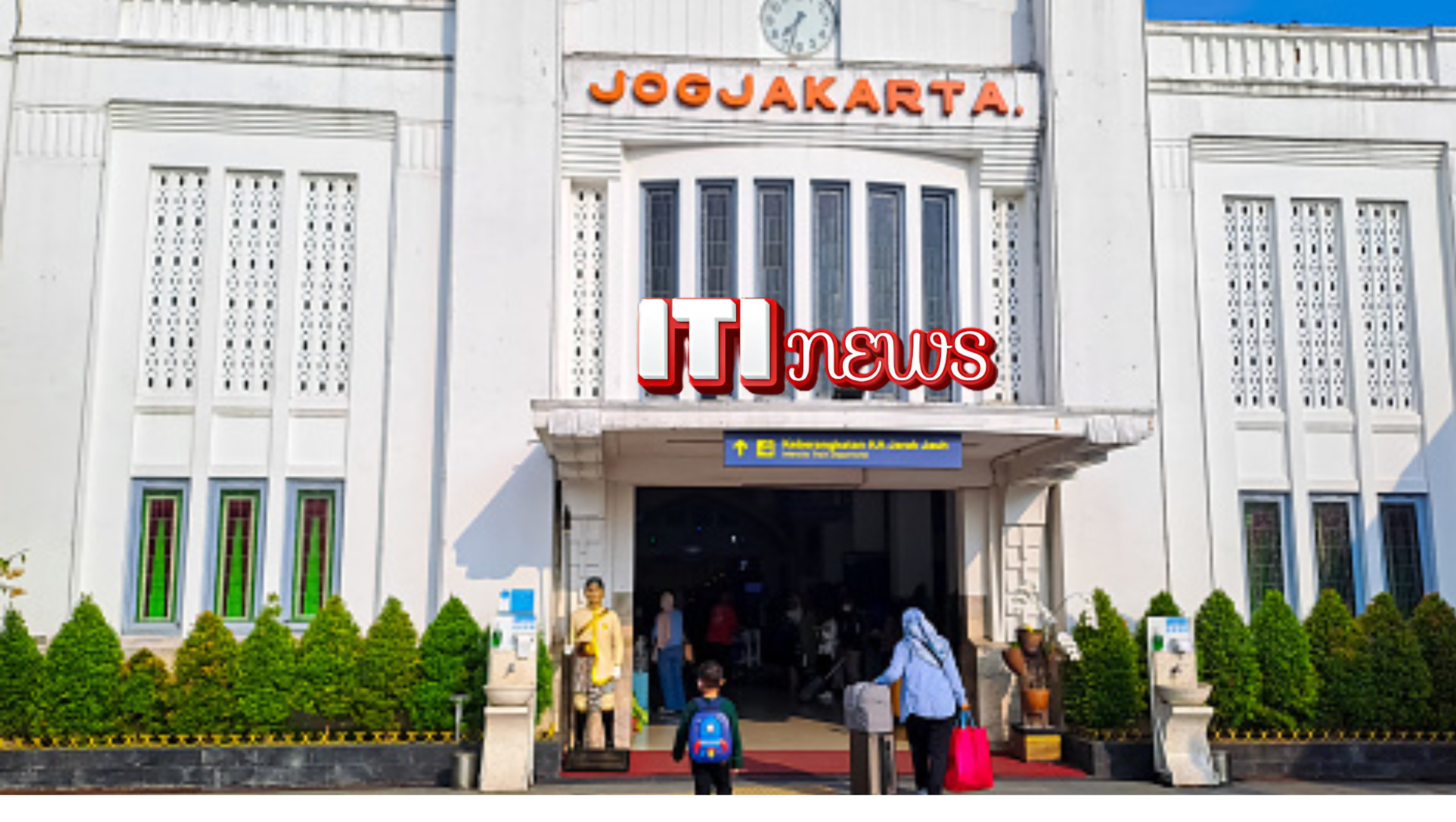 Foto Stasiun Tugu Yogyakarta diambil pada pagi hari, menunjukkan aktivitas penumpang yang keluar masuk stasiun.