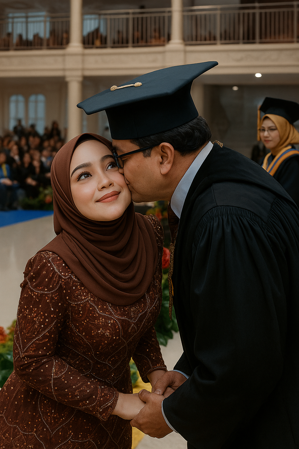 Seorang mahasiswi yang baru saja menerima ijazahnya tiba-tiba berhenti di depan pejabat kampus dan memintanya untuk mencium keningnya. Penonton sontak heboh. Para dosen terkejut, wisudawan lain terpaku, dan kamera yang menyiarkan langsung acara itu menangkap seluruh momen mengejutkan itu secara utuh.